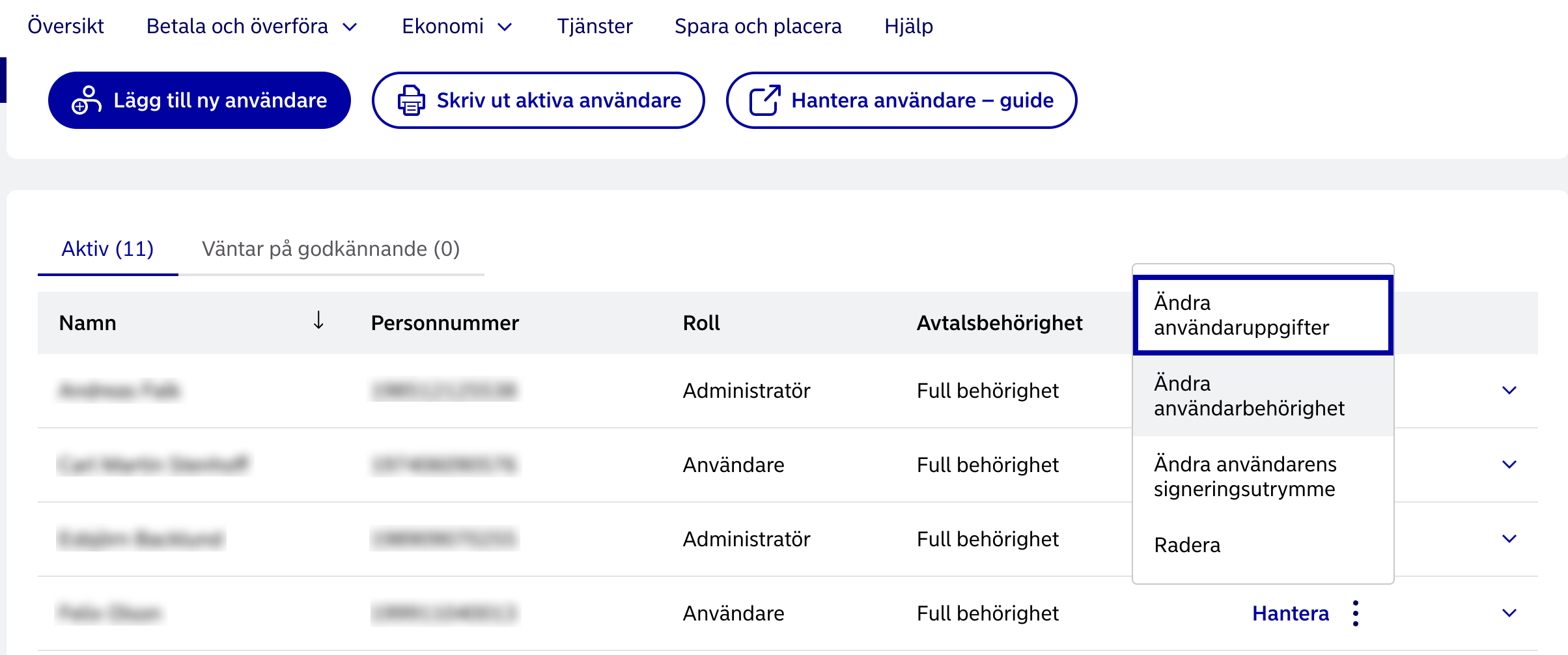 1. Siirry verkkopankissa kohtaan "Käyttäjien hallinta".